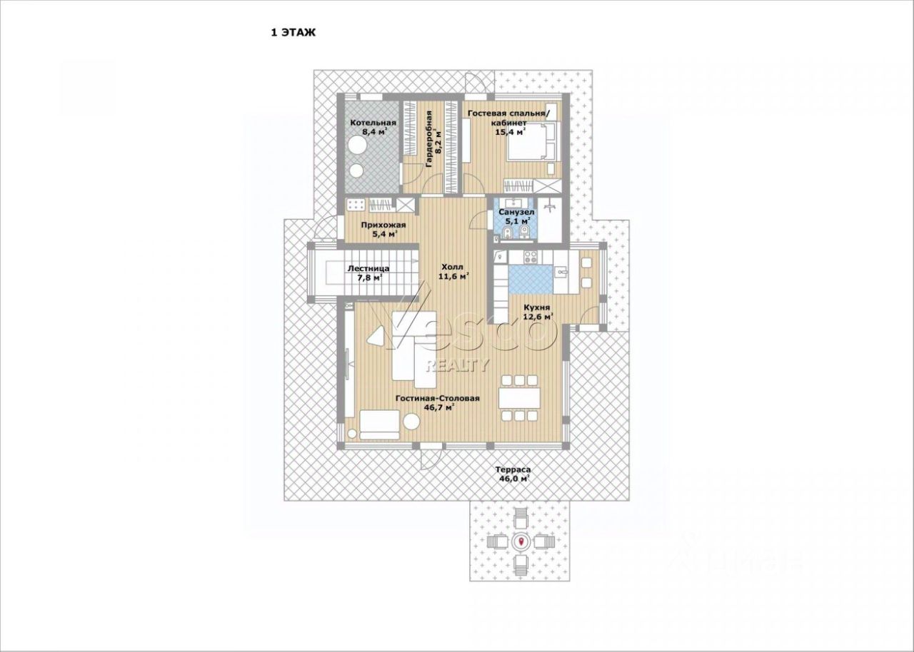 В доме: 4 спальни, гостиная-столовая и кухня с выходами на просторное патио из качественной ДПК-доски, 3 гардеробных, 3 с/у, включая гостевой на 1 этаже с просторной душевой, панорамная ванна и просторная душевая в ванной при мастер-спальне, котельная-постирочная.