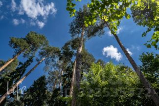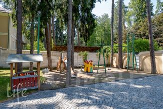 Участок с лесными деревьями. На территории гараж на три автомобиля с блоком для обслуживающего персонала, зона барбекю, детская площадка.