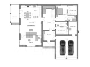 Первый этаж — кухня с выходом на террасу, кабинет, спальня с санузлом, постирочная, гостевой санузел, котельная и гараж на два автомобиля.