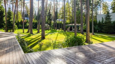 На участке гараж с квартирой для персонала, отдельная русская баня, зона отдыха у бассейна и беседка BBQ. Просторный газон, цветущие кустарники и кроны сосен создают ощущение уединённого лесного парка. Здесь приятно встречать утро под аромат хвои, устраивать вечерние ужины у камина и отдыхать у воды, не покидая своей резиденции.