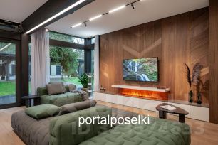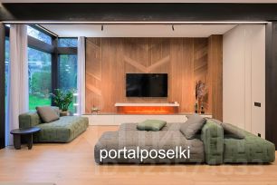В большой гостиной барная стойка для завтраков, обеденный стол на 8 персон, современный дизайнерский диван от Boca room на котором одинаково удобно общаться с друзьями, смотреть телевизор или любоваться игрой света парового камина. Вся мебель дома в натуральном шпоне ценных пород дерева, практичные столешницы из кварцевого агломерата и крупноформатного керамогранита заметно упрощают жизнь хозяевам. Как оборудование и современные инженерные системы проверенных брендов. Приточная вентиляция с фильтром, канальным кондиционирование и увлажнением не помешала установке в каждой комнате фрамуг с дистанционным открыванием (что позволяет наслаждаться пением птиц и в комнате).
