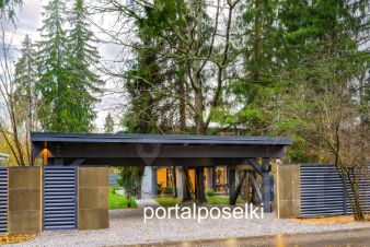 На въезде в домовладение вас встречает брутальный просторный навес для трех автомобилей, собранный из огромных клееных балок. Он обеспечивает дополнительную приватность, а в его правой части размещено всё необходимое для зарядки Вашего электромобиля.