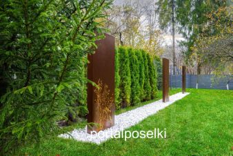 В этом объекте авторам удалось объединить вековые ели и дубы, фантастический каштан, огромные орешники и пятидесятилетние плодоносящие яблони с партерным газоном и современными эстетическими решениями из кортена, нержавеющей стали и клееной конструкционной древесины.