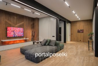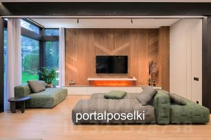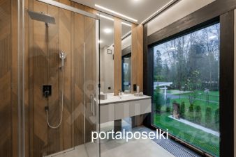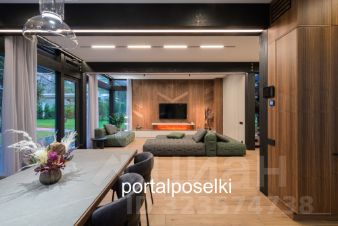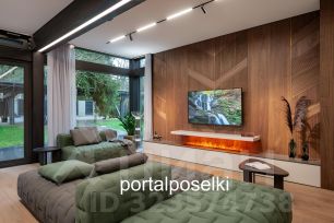В большой гостиной барная стойка для завтраков, обеденный стол на 8 персон, современный дизайнерский диван от Boca room на котором одинаково удобно общаться с друзьями, смотреть телевизор или любоваться игрой света парового камина. Вся мебель дома в натуральном шпоне ценных пород дерева, практичные столешницы из кварцевого агломерата и крупноформатного керамогранита заметно упрощают жизнь хозяевам. Как оборудование и современные инженерные системы проверенных брендов. Приточная вентиляция с фильтром, канальным кондиционирование и увлажнением не помешала установке в каждой комнате фрамуг с дистанционным открыванием (что позволяет наслаждаться пением птиц и в комнате).