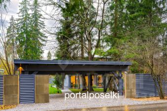 На въезде в домовладение вас встречает брутальный просторный навес для трех автомобилей, собранный из огромных клееных балок. Он обеспечивает дополнительную приватность, а в его правой части размещено всё необходимое для зарядки Вашего электромобиля.