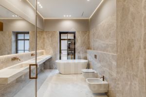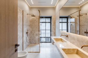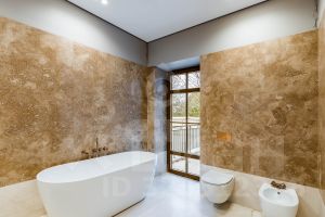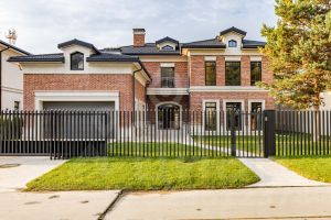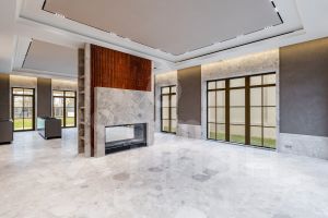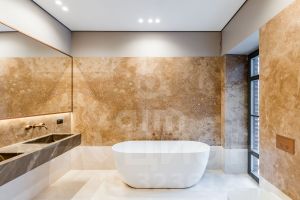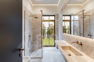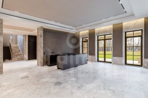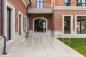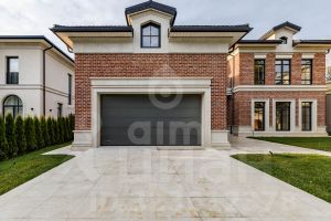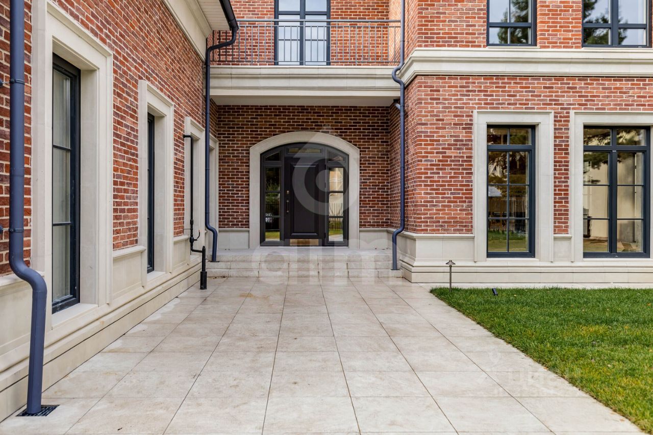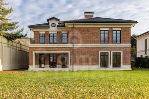 Фасад выполнен из клинкерного кирпича и натурального камня, крыша покрыта черепицей, установлены деревянные панорамные окна и система центрального кондиционирования. В доме использованы премиальные материалы отделки, а панорамное остекление наполняет пространство светом и подчеркивает гармонию с природой.