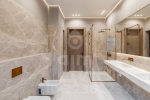 1 этаж: прихожая, гардеробная, постирочная, холл, гостевой санузел, гостиная с выходом на террасу, кухня-столовая, рабочая кухня, гостевая спальня с санузлом, СПА-зона (комната отдыха, сауна), постирочная, гараж на 2 м/м;