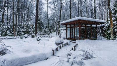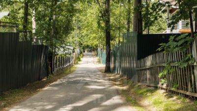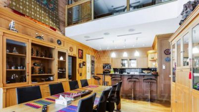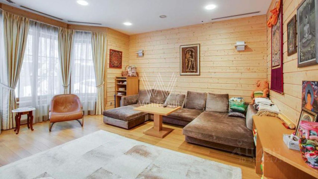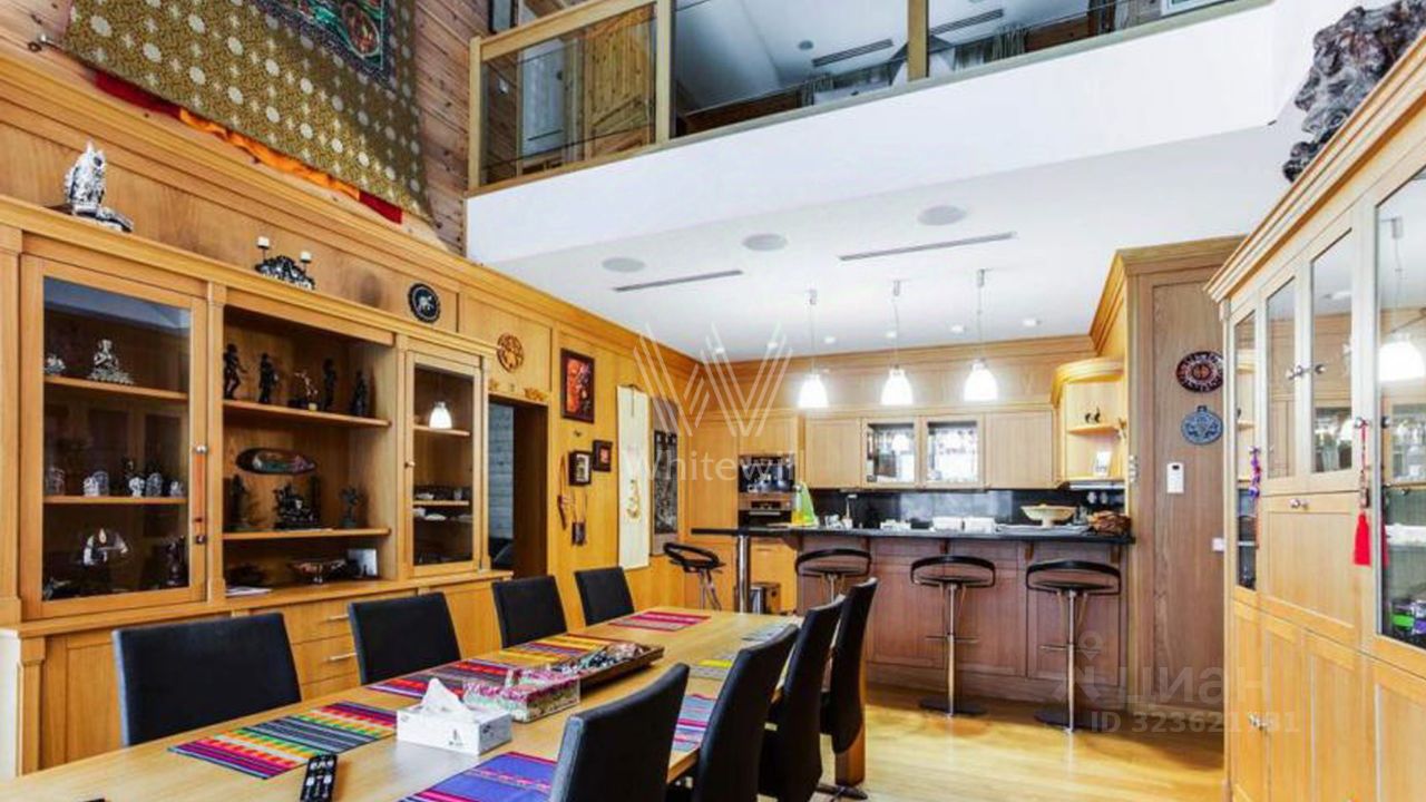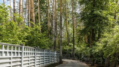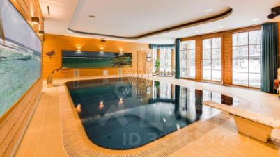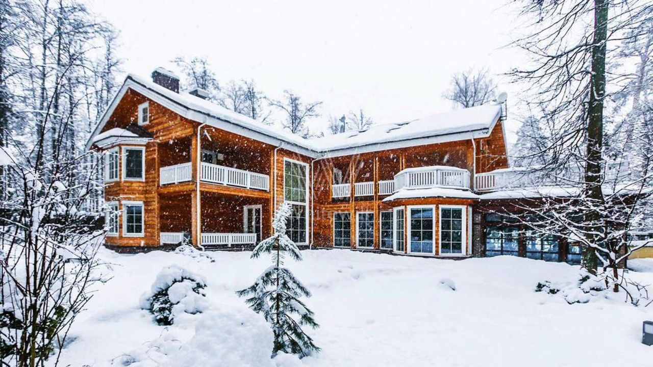 Ильинские дачи. Резиденция в стиле "шале" площадью 1300 м² расположена на лесном участке 20 соток. Деревянный фасад отличается большими окнами и открытыми террасами. В доме разместили СПА-зону с бассейном, кухню-гостиную со вторым светом, и 5 спален. В отделке интерьера преобладает дерево. На просторном участке с лесными деревьями построили два гаража для 4 машин и чайный домик в японском стиле на берегу искусственного озера с каскадом водопадов.