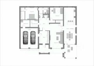 Первый этаж - гараж (43 кв.м.) на два машиноместа, из которого обеспечен доступ в изолированный холл дома (16 кв.м), куда помимо гаража есть центральный вход с улицы. Далее из первого холла попадаем во второй не менее просторный холл (16 кв.м), где прямо расположен санузел, слева - постирочная (7 кв.м) и спальня (20 кв.м) со своим гардеробом (6 кв.м), а справа - кабинет (23 кв. м). Еще правее открывается большая гостиная (40 кв.м), которая сообщается с кухней-столовой (53 кв.м) и имеет свой выход на уличную террасу (39 кв.м).