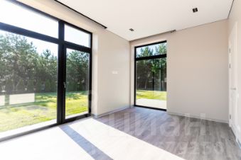 Ландшафт участка (12 соток), как и стиль дома, лаконичен: по периметру посажены туи, на территории ухоженный газон. Конфигурация участка классическая - прямоугольная форма. Красивые виды на местный ландшафт можно наблюдать из каждой комнаты, оборудованной панорамными окнами.