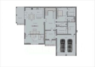 На первом этаже расположен просторный гараж (45 кв.м) с доступом в коридор (11,6 кв.м). Из коридора мы перемещаемся в холл (30 кв.м), где прямо размещена лестница, справа - постирочная (9,7 кв.м), санузел (5 кв.м), гостевая комната (17,8 кв.м) со своим санузлом (4,5 кв.м) и гардеробной (8,5 кв.м). Слева находятся совмещенные кухня (22 кв.м) с выходом на веранду (17 кв.м) и гостиная (39 кв.м) с доступом в кабинет (20 кв.м).