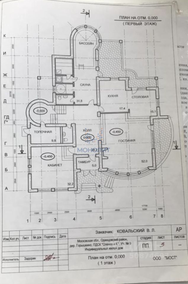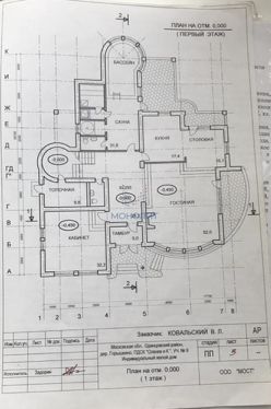 Первый этаж : просторный холл, кабинет, топочная, гостиная, кухня, столовая, сауна, санузел, гараж на 4 авто с санузлом;