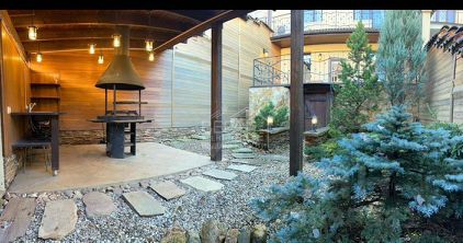 Из гостиной на первом этаже имеется выход н а огромную, очень функциональную летнюю террасу 30 кв.м., с которой можно спуститься во внутренний, закрытый и огороженный, сплошным забором двор, с расположенной на нем зоной барбекю.