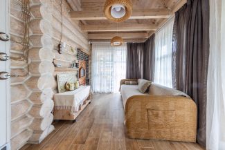 5. Баня с двумя помещениями: 1. Гостевая комната с раскладным диваном с ортопедическим матрасом, мини кухня и телевизор; веранда для отдыха с массажным столом и раскладным диваном;