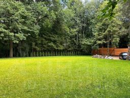 Участок уже выровнен, уложен газон, сделан полив , дренаж, разводка освещения и проведены дорожки.