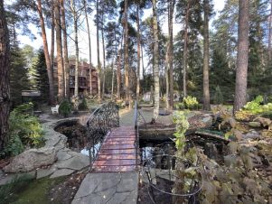 ОБ УЧАСТКЕ: 21,84 сотки. Выполнен ландшафтный дизайн. Потрясающие вековые сосны. Мангальная зона. Теплица. Естественный ручей ювелирно вписан в ландшафт. Искусственный живописный пруд, вольер для собаки. Участок огорожен кирпичным забором. За участком расположен живописный пруд.