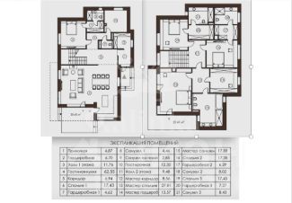 1 этаж: прихожая, гардеробная, холл, санузел, объединённая кухнястоловаягостиная с выходом на террасу, спальня с индивидуальным санузлом и гардеробной, котельная.