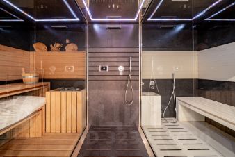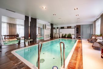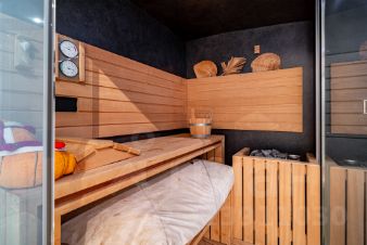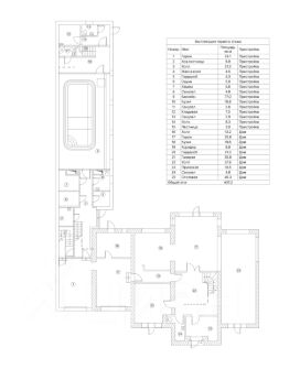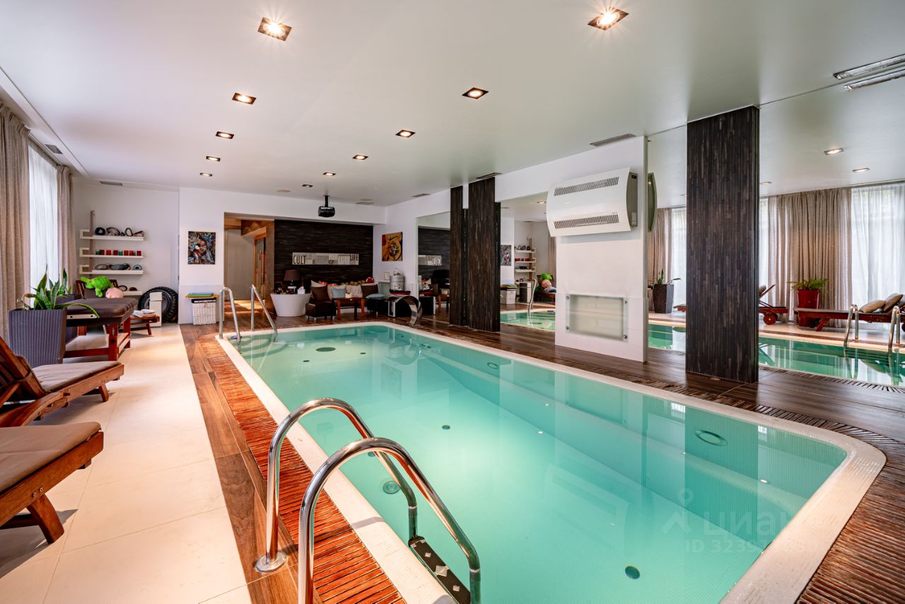 1 этаж: Жемчужина дома — зона релакса с бассейном 7*3 м (с противотоком), сауна, хаммам, душевая, раздевалка. А также квартира для персонала (2 спальни, кухня) и спортзал.