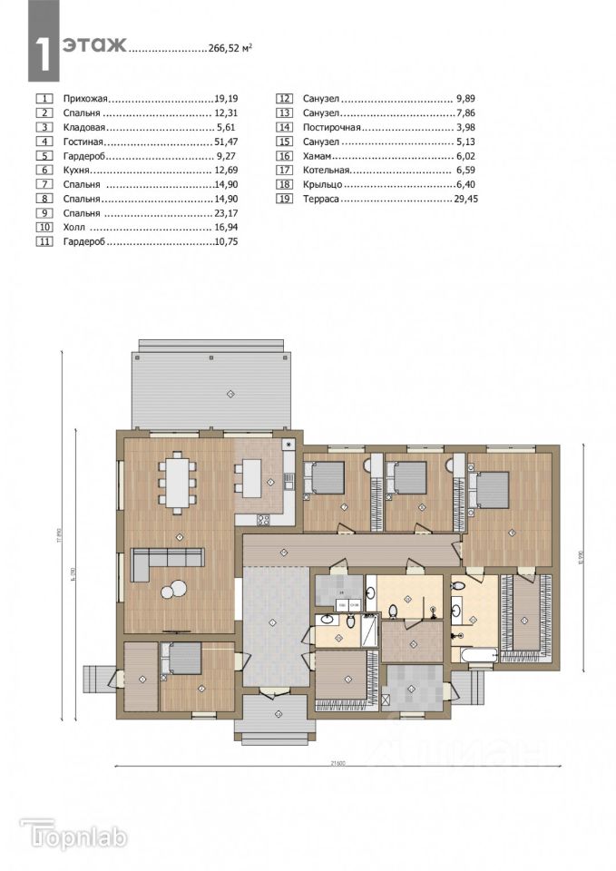Площадь дома: 266,5 м² — идеальное пространство для комфортной жизни большой семьи.