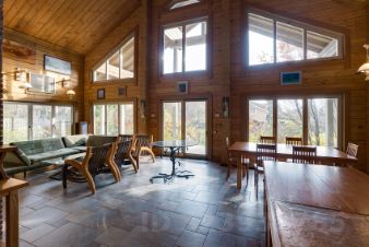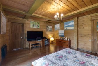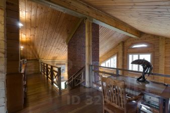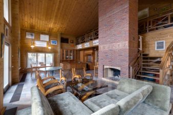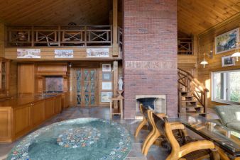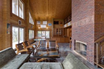 Основной дом построен из профилированного кедрового бруса, хранящего аромат кедрового леса. Площадь дома 272 квадратных метра. Есть две спальни, ванная комната, гостевая туалетная комната, большая гостиная, высота потолка в которой составляет 7,5 метров и в которой находится уникальный камин. Камин сложен из сделанного на заказ реставрационного кирпича и украшен изразцами, сделанными по специальному заказу талантливым художником. Деревянные рамы оконных стеклопакетов сделаны из лиственницы.