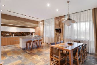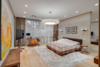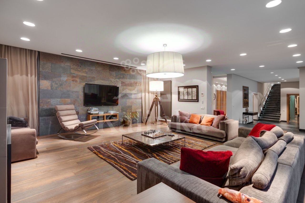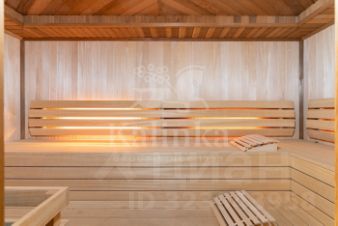 1 этаж: две гардеробные, гостиная, кухня-столовая, спальня с гардеробом и ванной комнатой, постирочная, кинотеатр. СПА-зона: бассейн, сауна, душевая, санузел; гараж на 2 м/м с квартирой для персонала.