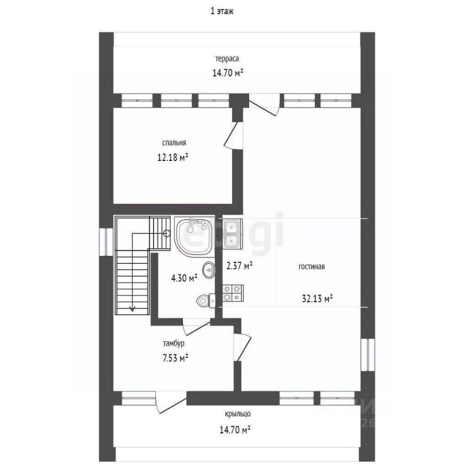 На первом этаже расположена просторная кухня-гостиная 34 кв.м., спальня (гостевая)/кабинет 12,2 кв.м. и санузел.