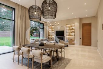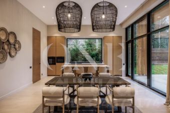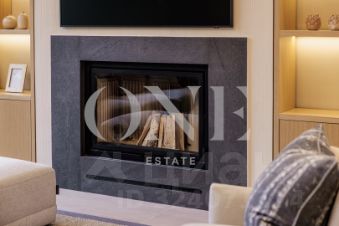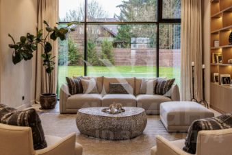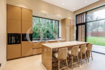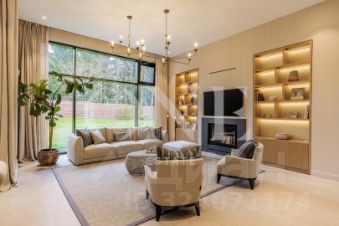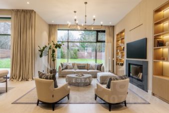 Встроенная кухня с островом и стеллажи из шпона дуба. Установлена шведская техника Acko и плита со встроенной вытяжкой Nikola Tesla. Теплые водяные полы Rehau во всех помещениях, внутрипольные конвекторы во всех комнатах, котел Vaillant и бойлер на 300 литров. Сделан дренаж участка и ливневая канализация, выполнена подсветка деревьев, уложен спортивный газон. Выполнена архитектурная подсветка фасада и территории участка. Все центральные коммуникации (газ, свет, вода, канализация, оптоволоконный интернет)