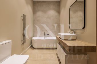 Алюминиевые окна Alutex высотой 3,6 метра, двойной энергоэффективный крупноформатный стеклопакет, площадь остекления фасада более 40%. В отделке использованы: межкомнатные двери высотой 3 метра (шпон дуба), плитка Porselanosa, Французские моющиеся краски Argile, текстильные широкоформатные обои в спальнях.