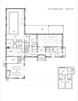 1 этаж: главный холл, гардеробная, с/у, кладовая, гостиная-кухня-столовая с выходом на террасу, рабочая кухня с отдельным входом и зоной отдыха для персонала, кладовая, лестничный холл, спальня с с/у, спа-зона с бассейном, комнатой отдыха, хаммамом, душевыми, массажной зоной, раздевалкой и с/у, котельная, гараж на 2 а/м.