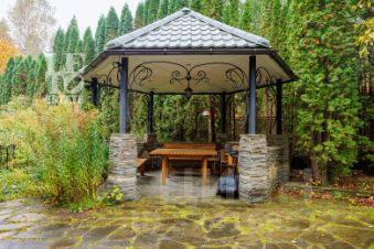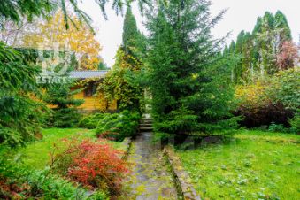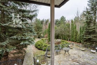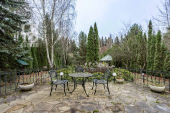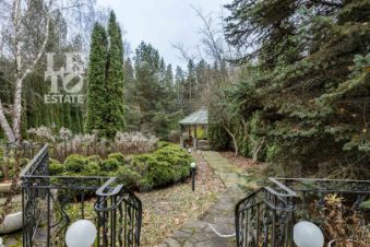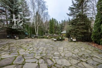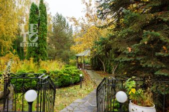 Выполнен ландшафтный дизайн, вымощены дорожки натуральным камнем, по всему периметру высажены огромные туи, на участке сосны и ели, освещение, беседка, площадка для барбекю, домик для персонала, пруд.