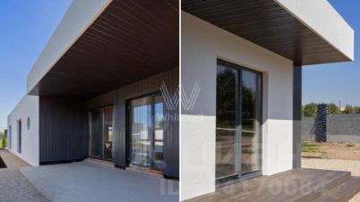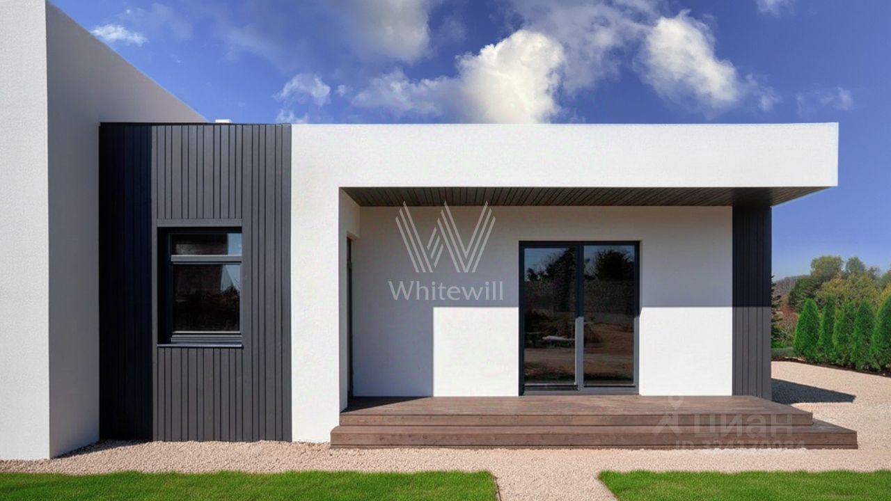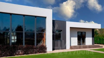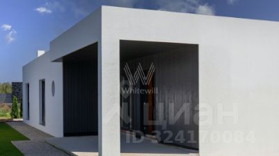 Рублёво-Успенский. Загородный коттедж площадью 190 м² расположен на полевом участке 6 соток. Минималистичный фасад облицован белоснежной штукатуркой и дополнен контрастными тёмно-серыми панелями. Благодаря большим панорамным окнам и потолку высотой 4,2 метра внутри всегда много естественного света. Отсутствие отделки позволяет будущим владельцам реализовать любой дизайн-проект, выбрав финишные покрытия, мебель и технику на свой вкус.