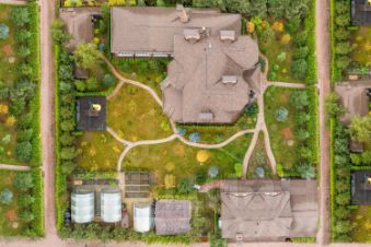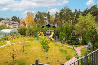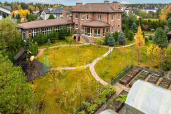 Уложен газон, высажено около 150 хвойных крупномеров: редкие виды сосен, голубые ели, пихты, туи, можжевельники и декоративные кустарники. Цветущий оазис на участке создает великолепный розарий с разными сортами роз, метельчатые гортензии и рододендроны. Для выращивания овощей и зелени, установлены отапливаемые и оборудованные автополивом теплицы.