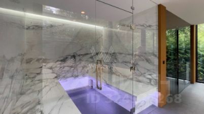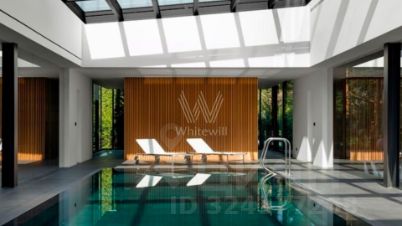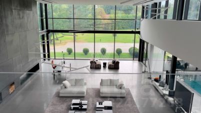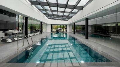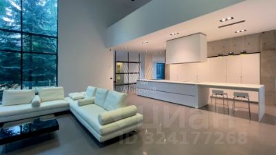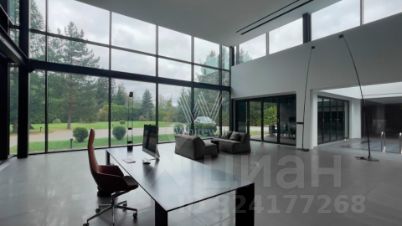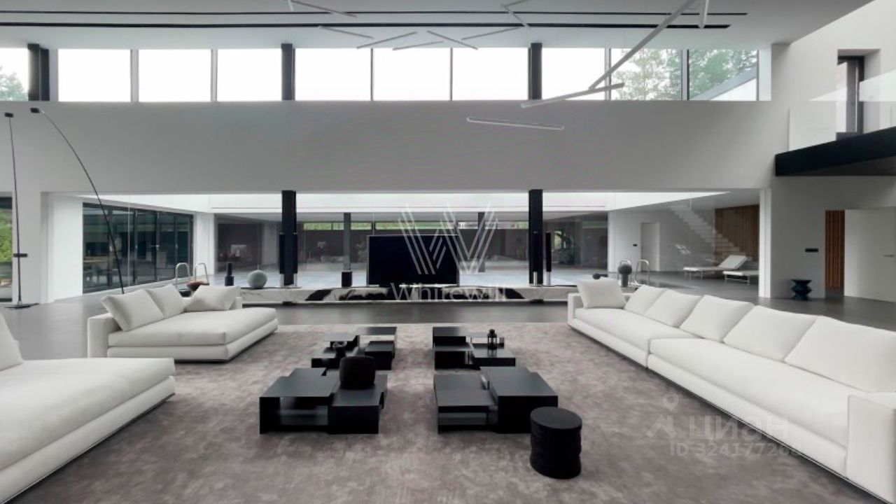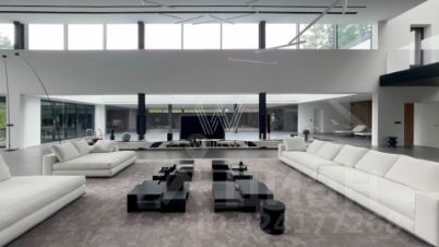 Лайково-2. Загородная резиденция площадью 1900 м² расположена на полевом участке 48,6 соток. Большие панорамные окна и потолоки до 8 метров высотой наполняют пространство воздухом и светом. Лаконичный интерьер в современном стиле выдержан в бело-серых оттенках. В доме предусмотрены 4 спальни, гостиная с камином и вторым светом, кухня-столовая, SPA-зона с бассейном, хамамом и сауной, библиотеку, гараж для коллекционных машин и гараж с мойкой на 3 машины. Внутри разместили блок для персонала и комнату для охраны и видеонаблюдения с отдельными входами. Во дворе можно проводить время на террасе с зоной барбекю. На участке выполнен ландшафтный дизайн, вымощены дорожки и высажены кустарники.