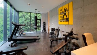 2-й уровень: библиотека, тренажерный зал с санузлом и душевой, 2 спальни с санузлами, гардеробная, спальня с гардеробной, санузлом, сауной и хамамом, кабинет, комната отдыха, мини-кухня, санузел, блок для персонала с отдельным входом, санузел, комната для охраны, санузел.