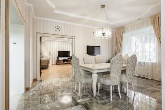 В продаже особняк в классическом стиле. Коттеджный посёлок Отрада, расположен в непосредственной близости от поселения Горки-10 на Рублево-Успенском шоссе,в котором вся необходимая для жизни инфраструктура: государственные и частые взрослые и детские поликлиники, частные и государственные общеобразовательные школы, детские сады, спортивная школа, сетевые магазины (Перекресток, Магнит, Пятёрочка, Вкусвилл, Азбука вкуса), дом культуры, почта России, пункты выдачи Ozon, Wildberries, CDEK, торговый центр "Огород". Недалеко пансионат "Лесные дали", возможность проезда к Москва-реке, где оборудован комфортный пляж с прокатом водного инвентаря, кафе и рестораны, Московский Конный завод, Ломоносовская школа, Успенская Церковь, спортивный комплекс "Ангелы Плющенко", огромное количество ресторанов, несколько фитнес-центов. Удобный выезд на платную дорогу, до центра Москвы можно добраться за 45-50 минут. В коттеджном посёлке солидное окружение, большие дома и участки, детская площадка. Территория находится под охраной, въезд и выезд по пропускам. Все центральные коммуникации: вода, канализация, электричество (подземное) и газ. Высокоскоростной оптоволоконный интернет. Площадь участка 15 соток. Участок огорожен забором на монолитном ленточном фундаменте, въездная группа из кирпича. Парковка, отмостка и дорожки выполнены из каменной брусчатки на железобетонном основании. Участок ровный. Благоустроенная территория, много хвойных и плодовых деревьев, цветов, теплица. Площадь дома составляет 346,5 кв.м. В общую площадь дома не входит мансардный этаж - ещё около 120 кв.м. В доме три входа: главный вход, вход через котельную (отдельный вход с улицы) и через гараж. Дом построен на железобетонном ленточном фундаменте с цокольным этажом. Стены из полнотелого кирпича (толщина внешних стен более 50 сантиметров), фасад из клинкерного кирпича Braer и мозаичной штукатурки. Отделка в классическом стиле - массив дерева, шпон, корпусная мебель из МДФ, испанский,итальянский керамогранит, дубовый паркет. Техника Smeg, качественная мягкая итальянская дубовая мебель. Газовая плита, котел Buderus, многоступенчатая система очистки воды. Современная планировка - 6 санузлов, 5 спален (включая мастер-спальню со своим санузлом), просторная гардеробная, кабинет, сауна с душевой и комнатой отдыха. Планировка коттеджа: 1. Цокольный этаж: котельная, сауна, душевая, комната отдыха. 2. Первый этаж: гардеробная, гостевой санузел, кухня, столовая, гостиная, кабинет со своим санузлом. 3. Второй этаж: мастер-спальня, две спальни, санузел, кладовая. 4. Мансардный этаж: две гостевые спальни, санузел, большая общая зона, в которой можно оборудовать кинотеатр или иную зону отдыха. Дом под тапочки и готов к проживанию. Территория полностью благоустроена, коттеджный посёлок полностью обжитой. Один взрослый собственник , полная стоимость в договоре.