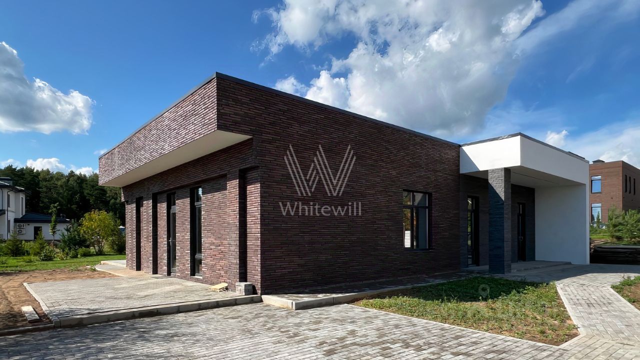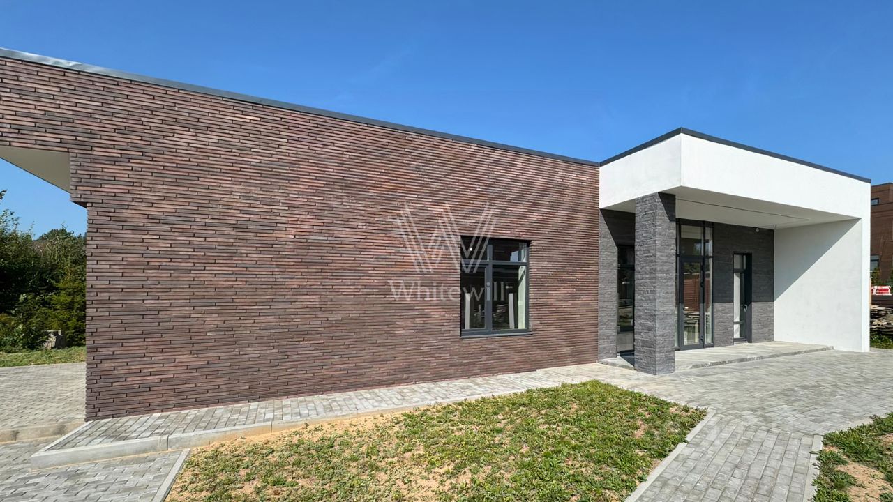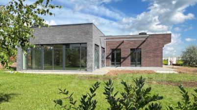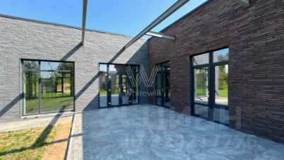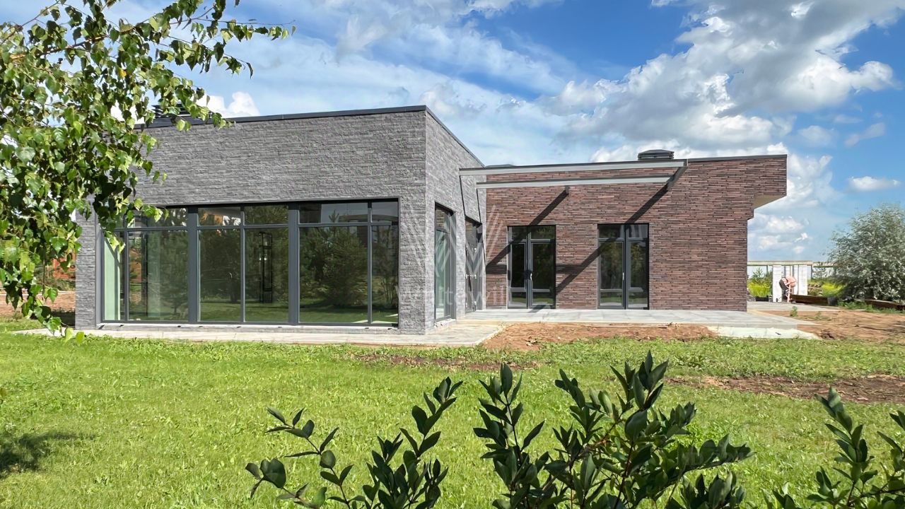 Никологорские дачи. Одноэтажный загородный дом площадью 250 м² построен на полевом участке 11 соток. Фасад здания в современном стиле облицован плиткой под ригельный кирпич и юрский мрамор, установлены двухкамерные стеклопакеты с профилем Melke. Благодаря потолкам высотой 3,6 метра и панорамному остеклению внутреннее пространство наполнено воздухом и светом. В резиденции с отделкой whitebox осталось лишь выбрать финишные покрытия. Планировкой предусмотрены 3 спальни, гостиная с возможностью установки камина, техническая и хозяйская кухни, кабинет, сауна и 2 террасы. На ровном участке правильной формы выполнен ландшафтный дизайн, высажены ягодные кустарники, хвойные и лиственные деревья, установлена система полива.