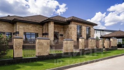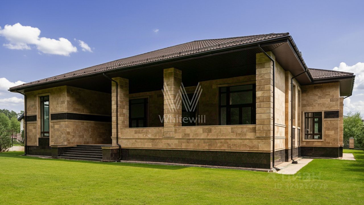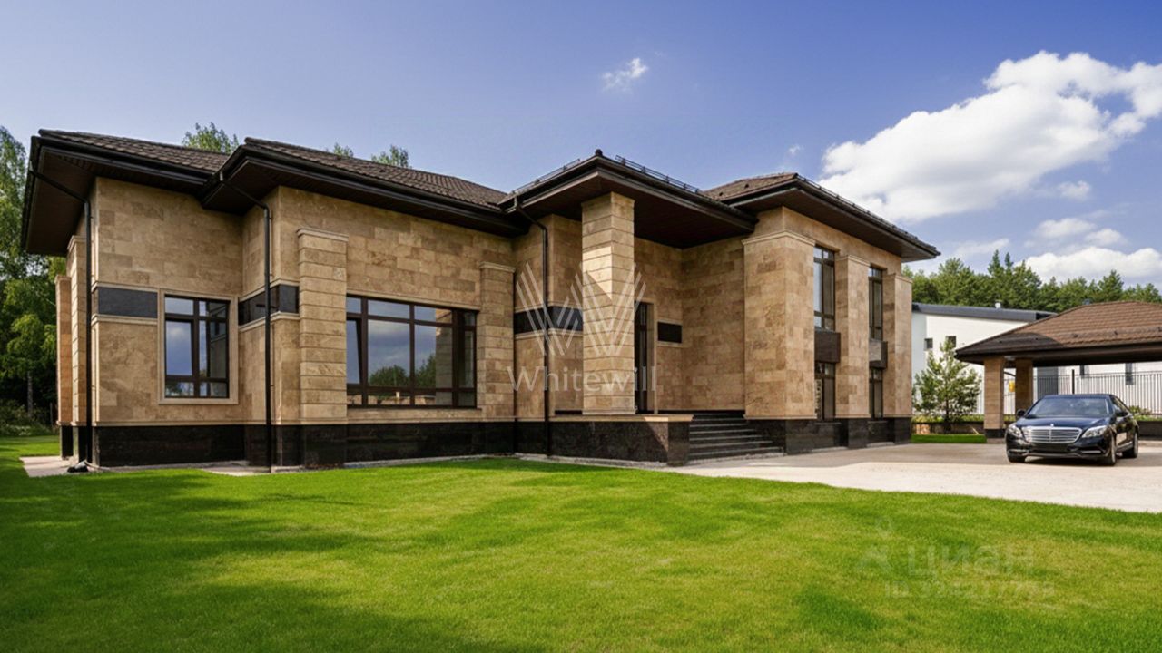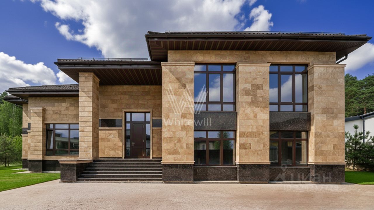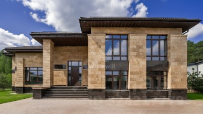 Никологорские дачи. Загородный дом площадью 590 м² расположен на участке 20 соток. Современный фасад с большими окнами облицован травертином и индийским гранитом. Отсутствие отделки открывает полную свободу для реализации любых дизайн-проектов — будущие владельцы смогут выбрать стиль интерьера, финишные покрытия, мебель и технику на свой вкус.