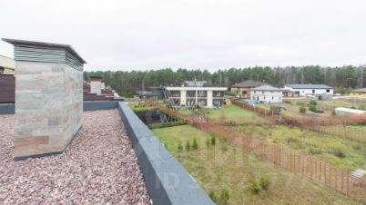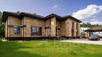 В двухэтажном коттедже спланировали просторную гостиную-кухню-столовую, террасу, четыре спальни, блок для персонала и спа-зону с сауной и комнатой свободного назначения, где можно будет оборудовать бильярдную или тренажёрный зал. Рядом с основным зданием возведён навес для машин. Кроме того, размер территории позволяет дополнительно возвести здесь уютную беседку-барбекю для уютных вечеров в кругу близких. На участке с живописным видом на лес засеян аккуратный газон.