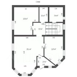 На первом этаже - гостиная/столовая, кухня, кабинет, прихожая, котельная, сан/узел.