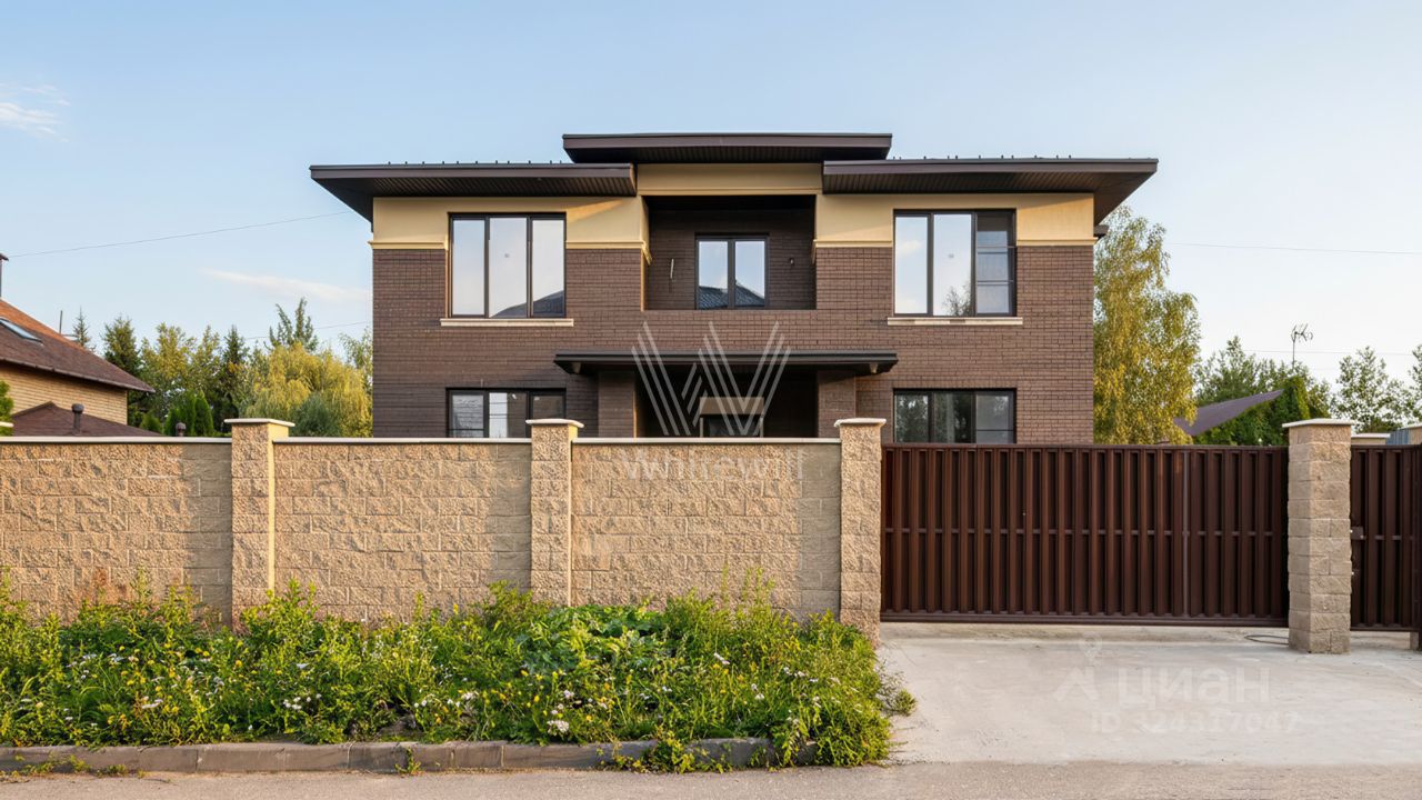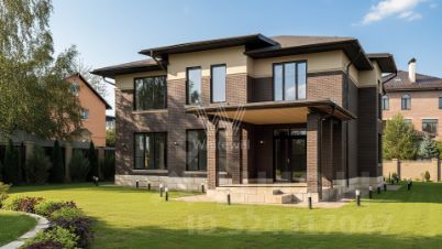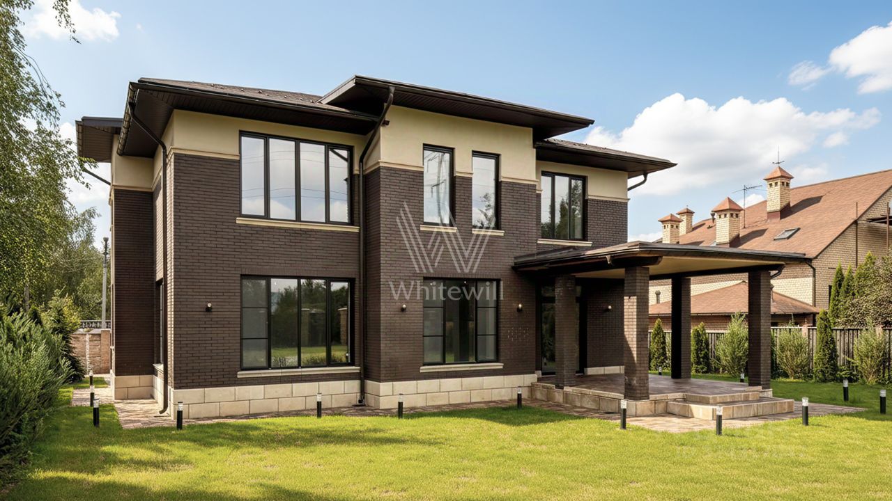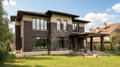 Горки-2 СТ. Загородный дом площадью 324 м² построен на полевом участке 10 соток. Фасад здания облицован коричневым клинкерным кирпичом. Резиденция с отделкой whitebox подходит для реализации индивидуального дизайн-проекта. Планировка коттеджа включает 4 спальни, гостиную, кухню и столовую. На участке можно выполнить ландшафтный дизайн, обустроить беседку с зоной барбекю.