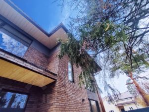 Дом двухуровневый, с панорамными окнами и мансардой под утепленной крышей.