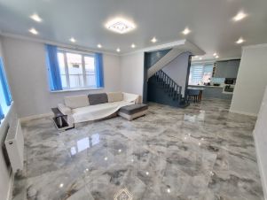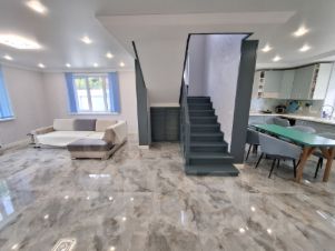 1-й этаж: Кухня, большая гостиная, кабинет, санузел, тех. помещения, терраса. 2-й этаж: четыре спальни, холл, санузел. Коммуникации: трехфазное электричество, скважина 120 м., фильтрация воды Wise Water, септик, кондиционирование во всех помещениях, теплые полы, проводной интернет.
