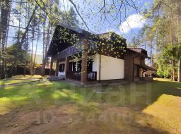 Удивительно гармоничный дом в стиле Шале в идеальном состоянии на лесном участке с вековыми соснами. На участке отдельно расположен гараж на 2 машино- места с квартирой для персонала. Основной дом - Шале, круглогодично отапливается. Внутри разведена электрика , стены готовы под покраску, полы со стяжками, утеплитель на потолках. Крыша из натуральной черепицы. Цоколь сухой, с окнами. Вокруг дома сделана качественная гидроизоляция и дренаж. Идеальная правильная форма участка. В доме две террасы: на втором этаже - в мастер-спальне и на первом этаже - выход из столовой. Отделка натуральным деревом (кедр) с лаком - в идеальном состоянии +штукатурка +камень. Тишина вокруг.