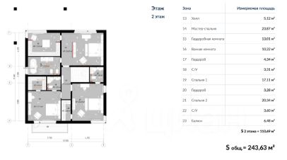На втором этаже полноценная мастер спальня с большой гардеробной и ванной комнатами, две детские спальни со своими санузлами и гардеробными. В одной из комнат присутствует балкон.