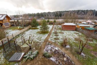 Озеленение: Участок украшен садом с плодовыми деревьями, создавая ощущение природной гармонии.