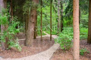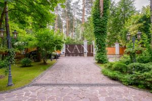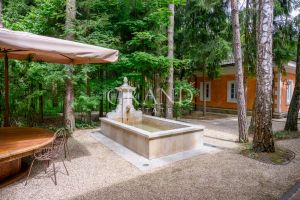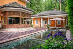 Большой участок в 75 соток разделен на несколько зон. Имеет зону бассейна, спортивную зону, летнюю кухню, и собственный лесопарк с декоративными фонтанами.