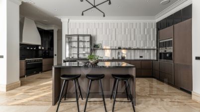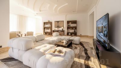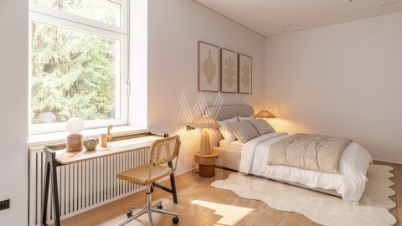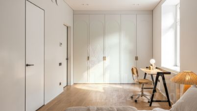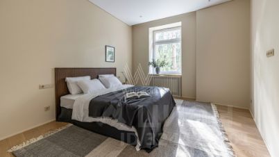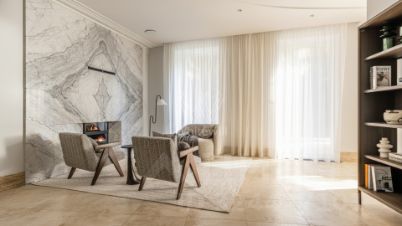 Интерьеры выполнены под ключ в скандинавском стиле. Светлая палитра, мебель из массива дуба и лаконичные акценты создают ощущение простора и естественного уюта. В отделке использованы подоконники из чёрного гранита и полы из травертина, дополненные декоративными панно.