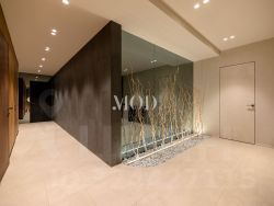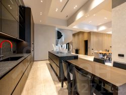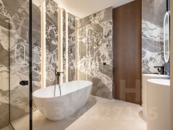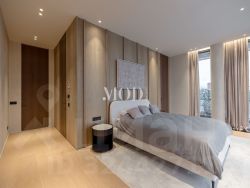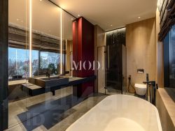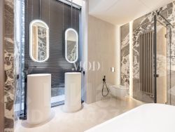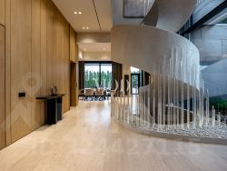 Дизайн интерьера построен на гармоничном сочетании открытых пространств и приватных зон. В отделке использованы премиальные материалы: натуральный камень редких пород, стеновые панели из шпона, декоративная штукатурка.