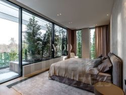Архитектурные особенности впечатляют своими масштабами: потолки высотой 4,2 метра на первом этаже и 3,1 метра на втором. Центральный атриум достигает 7,5 метров в высоту. Панорамное остекление выполнено из закаленного стекла толщиной 10 миллиметров. Терраса оборудована зоной для барбекю и системой автополива.
