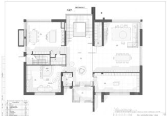 Цоколь: кинотеатр, бильярдная, бар, винный погреб, рабочая кухня, гардеробная, с/у, постирочная, кладовая, бойлерная.